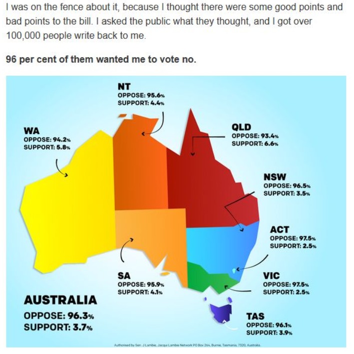 After passing in the House, and following a wave of popular opposition, the amendment failed in the Senate with the deciding vote (again) of Jacqui Lambi. Lambi, who was “on the fence” about the bill, surveyed over 100,000 Australians and decided to vote against the measure in line with 96% of respondents.